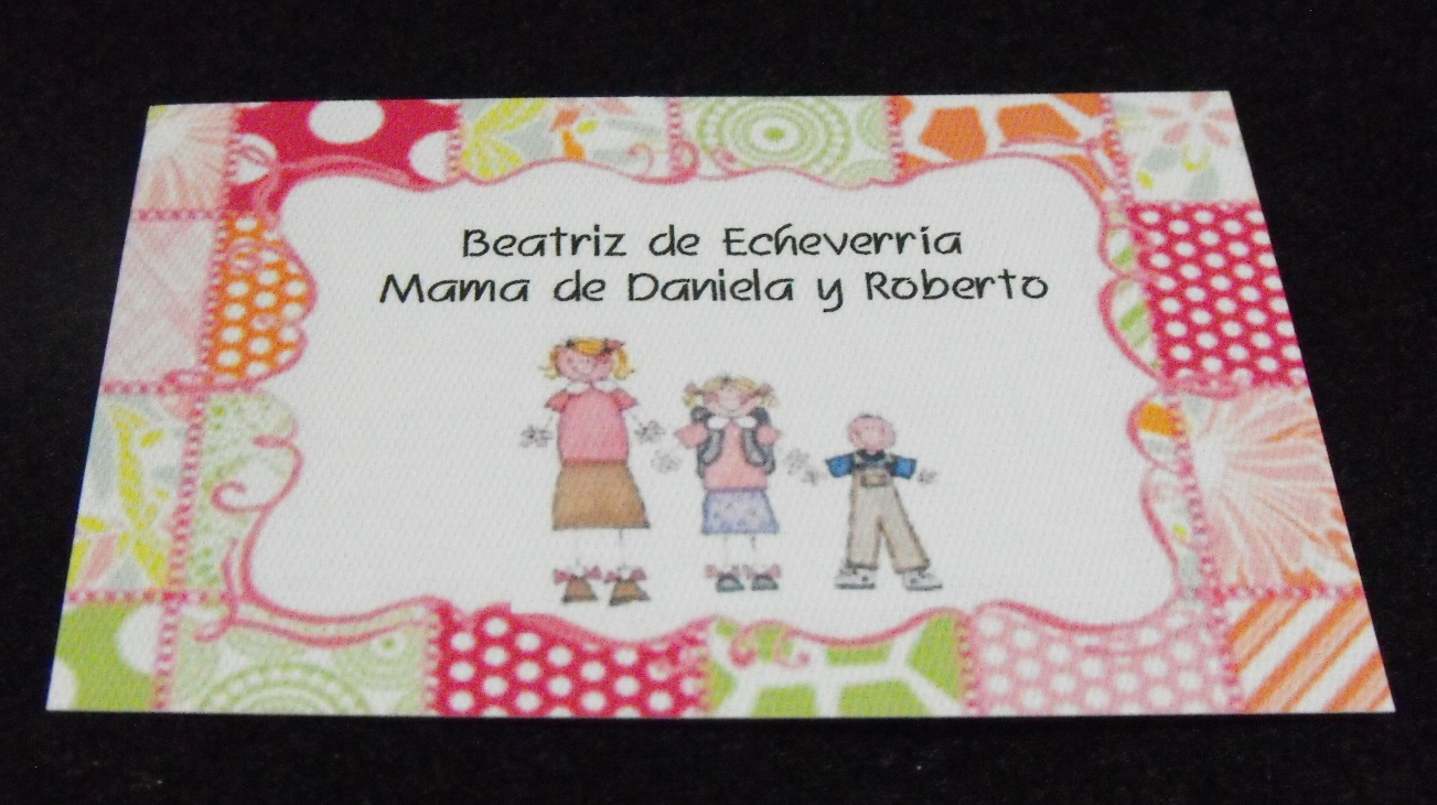 Al frente, tienen un dibujo de mis dos tesoros y yo. Y al reverso, he puesto mi información más general: correo de contacto, blog, profesión, teléfonos y las fechas de nacimiento de los nenes.