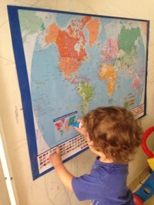 Frente al rincón de lectura hemos puesto un Mapa Mundi que además tiene segmentados los continentes y abajo las banderas. Me sorprendió que en cuanto lo puse, Daniela y Rober comenzaron a buscar las banderas de Brasil, España, El Salvador y Japón; ahí descubrí que esas ya las reconocen.