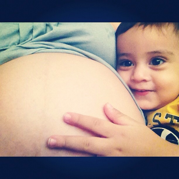 Foto: Nicolás haciendo cariño a Gabriel (en la panza)