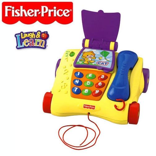Teléfono de arrastre que habla y canta. Promueve el aprendizaje por imitación de los números, los animales y sus sonidos.